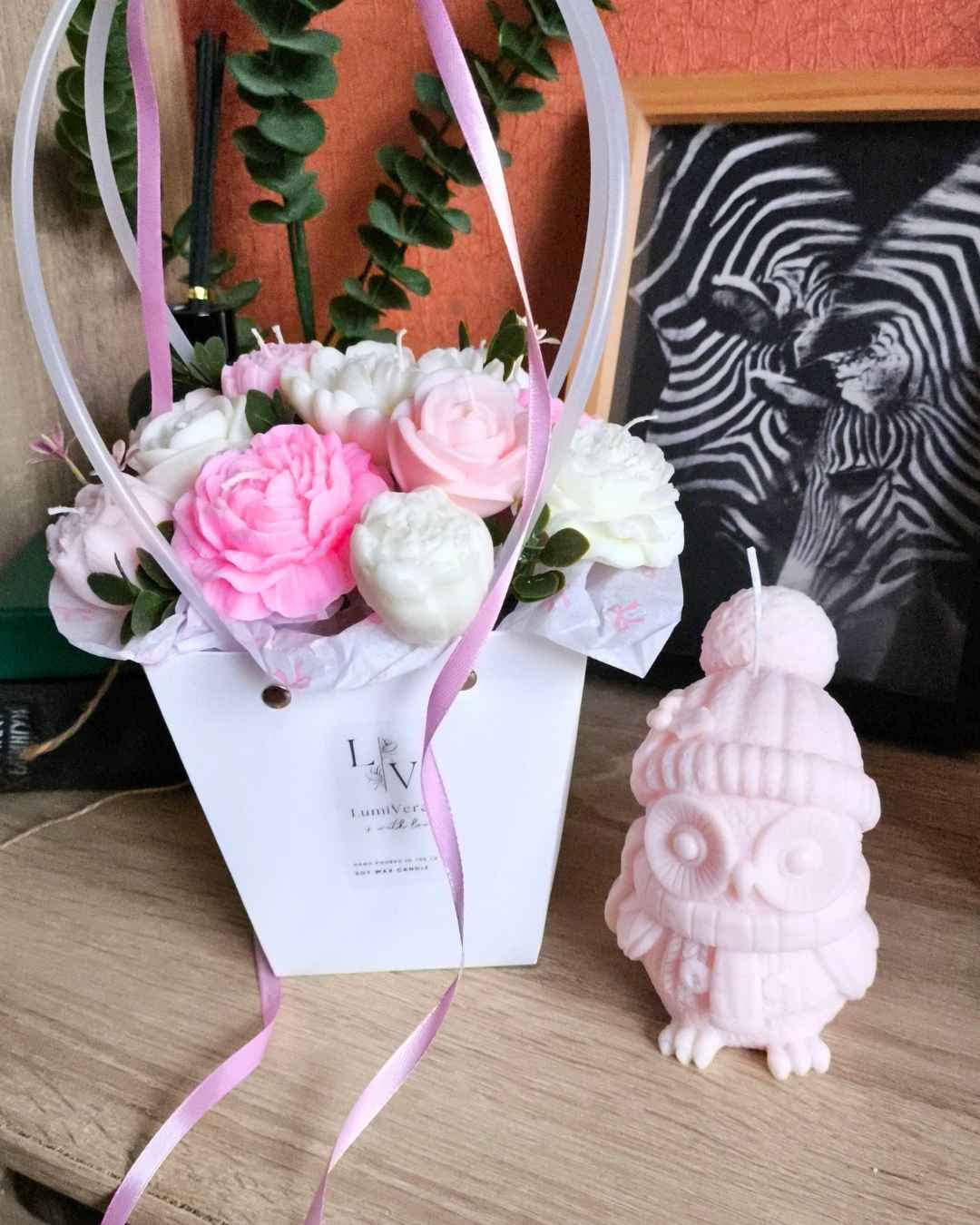 Winter Owl Dream ir sirsnīgs ziemas sveču komplekts, kurā apvienotas skaistas roku darinātas sveces un svētku dekori. Komplektā iekļauta pūces formas svece maigos pasteļtoņos, sniegpārsliņas svece, svētku eglītes dekors un ziemas aksesuāri, kas rada patiesi mājīgu un silti svinīgu noskaņu.